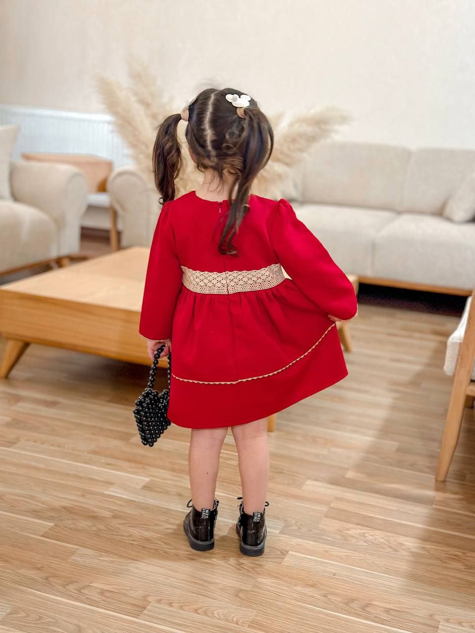 پیراهن دلبر یلدایی سلین با رنگ قرمز خاص و دیزاین کمربند گیپوری و ربان مخملی،